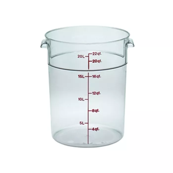An affordable choice. Use to store ingredients or transport ready to serve or partially prepared foods. Round shape promotes proper air circulation around container. Easy to read imprinted graduations on the outside for inventory at a glance. Molded-in holes in the handles for quick and sanitary drying. Snap on covers fit tightly, yet can be easily removed. (Note: lids are not interchangeable) Made of impact, stain and chemical resistant solid white plastic. Withstands temperatures from -40ºF to 160ºF. NSF listed.
