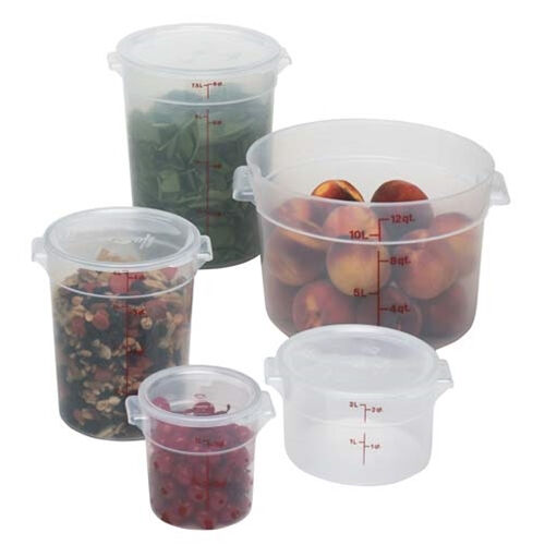 An affordable choice. Use to store ingredients or transport ready to serve or partially prepared foods. Round shape promotes proper air circulation around container. Easy to read imprinted graduations on the outside for inventory at a glance. Molded-in holes in the handles for quick and sanitary drying. Snap on covers fit tightly, yet can be easily removed. (Note: lids are not interchangeable) Made of impact, stain and chemical resistant solid white plastic. Withstands temperatures from -40ºF to 160ºF. NSF listed. Translucent material offers some product visibility. Use to store ingredients or transport ready to serve or partially prepared foods.