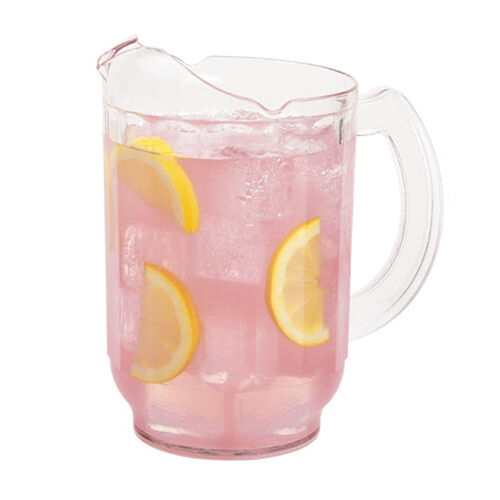 Hammered texture Side spout. Lightweight for easy handling. Exclusive ice-control contoured lip and pour spout reduce spills. Made of virtually unbreakable Camwear polycarbonate. Slotted base allows for complete and sanitary drying. Colours: clear (135). NSF listed.