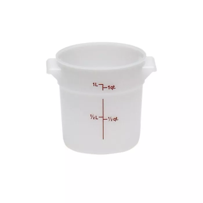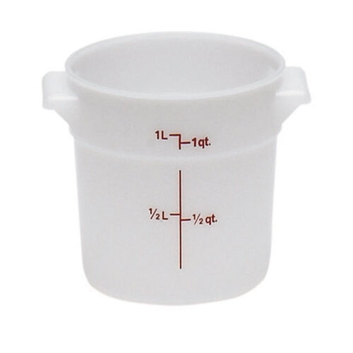 An affordable choice. Use to store ingredients or transport ready to serve or partially prepared foods. Round shape promotes proper air circulation around container. Easy to read imprinted graduations on the outside for inventory at a glance. Molded-in holes in the handles for quick and sanitary drying. Snap on covers fit tightly, yet can be easily removed. (Note: lids are not interchangeable) Made of impact, stain and chemical resistant solid white plastic. Withstands temperatures from -40ºF to 160ºF. NSF listed.