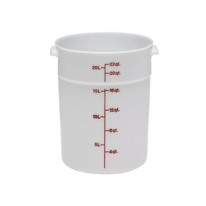 An affordable choice. Use to store ingredients or transport ready to serve or partially prepared foods. Round shape promotes proper air circulation around container. Easy to read imprinted graduations on the outside for inventory at a glance. Molded-in holes in the handles for quick and sanitary drying. Snap on covers fit tightly, yet can be easily removed. (Note: lids are not interchangeable) Made of impact, stain and chemical resistant solid white plastic. Withstands temperatures from -40ºF to 160ºF. NSF listed.
