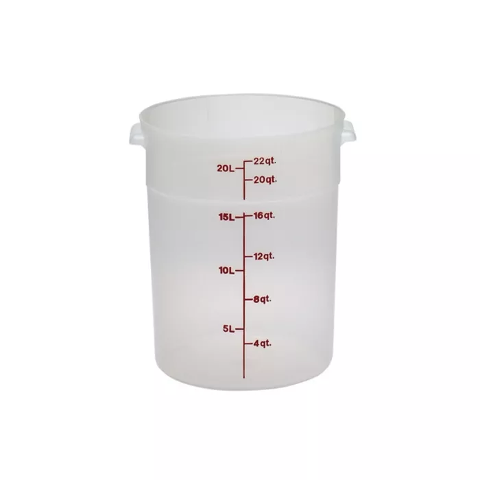 An affordable choice. Use to store ingredients or transport ready to serve or partially prepared foods. Round shape promotes proper air circulation around container. Easy to read imprinted graduations on the outside for inventory at a glance. Molded-in holes in the handles for quick and sanitary drying. Snap on covers fit tightly, yet can be easily removed. (Note: lids are not interchangeable) Made of impact, stain and chemical resistant solid white plastic. Withstands temperatures from -40ºF to 160ºF. NSF listed.