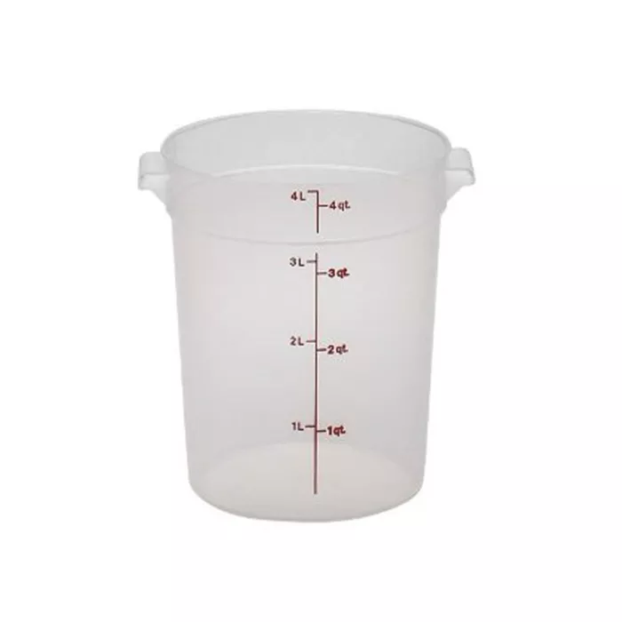 An affordable choice. Use to store ingredients or transport ready to serve or partially prepared foods. Round shape promotes proper air circulation around container. Easy to read imprinted graduations on the outside for inventory at a glance. Molded-in holes in the handles for quick and sanitary drying. Snap on covers fit tightly, yet can be easily removed. (Note: lids are not interchangeable) Made of impact, stain and chemical resistant solid white plastic. Withstands temperatures from -40ºF to 160ºF. NSF listed.
