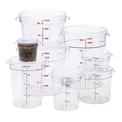 Use to store ingredients or transport ready to serve or partially prepared foods. Round shape promotes proper air circulation around container. Easy to read imprinted graduations on the outside for inventory at a glance. Molded-in holes in the handles for quick and sanitary drying. Snap on covers fit tightly, yet can be easily removed. (Note: lids are not interchangeable) Made of crystal clear, virtually unbreakable Camwear polycarbonate. Stain-resistant to food acids and oils. Withstands temperatures from -40ºF to 210ºF. NSF listed. Colours: clear (135).