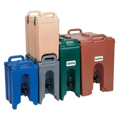 Contemporary line of beverage servers perfect for behind the scenes or in front of guests. Features two wide nylon latches per unit that are easy to open and close. Comes with a sticker label set (Coffee, Decaffeinated Coffee, Punch, Iced Tea, Hot Water & Blank) to identify the beverage. Colours: kentucky green, (519), navy blue (186), slate blue (401), brick red (402), dark brown (131), coffee beige (157), black (110), granite sand (194), granite gray (191), granite green (192).