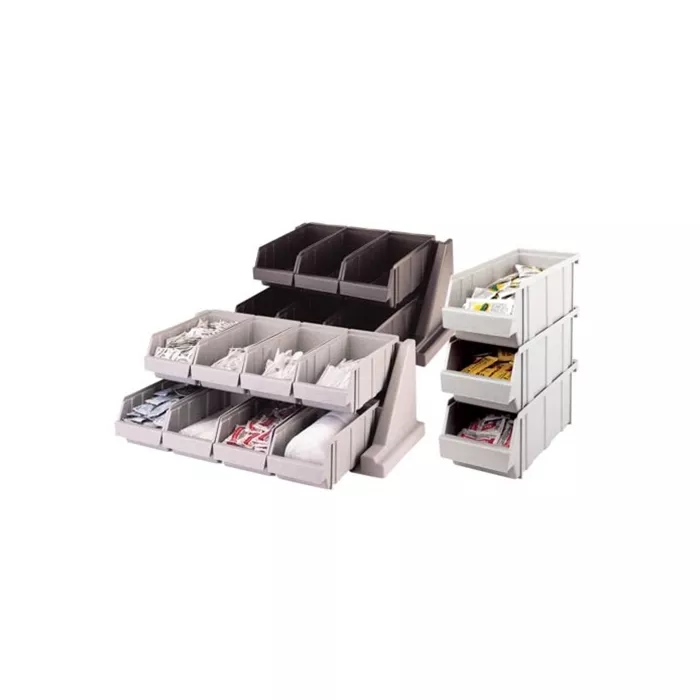 Use to store non-perishable condiments, disposable ware and napkins. Hold bins in 2 x 3, 2 x 4, 3 x 3, or 3 x 4 arrangements based on need. Made of seamless one-piece polyethylene. Easy to assemble and easy to clean. Set on flat surface or wall mount (each bin holds up to 10 lbs). Pack colours: dark brown (131), black (110), speckled gray (480). Bin only colours: coffee beige (157), dark brown (131), black (110), slate blue (401), speckled gray (480).