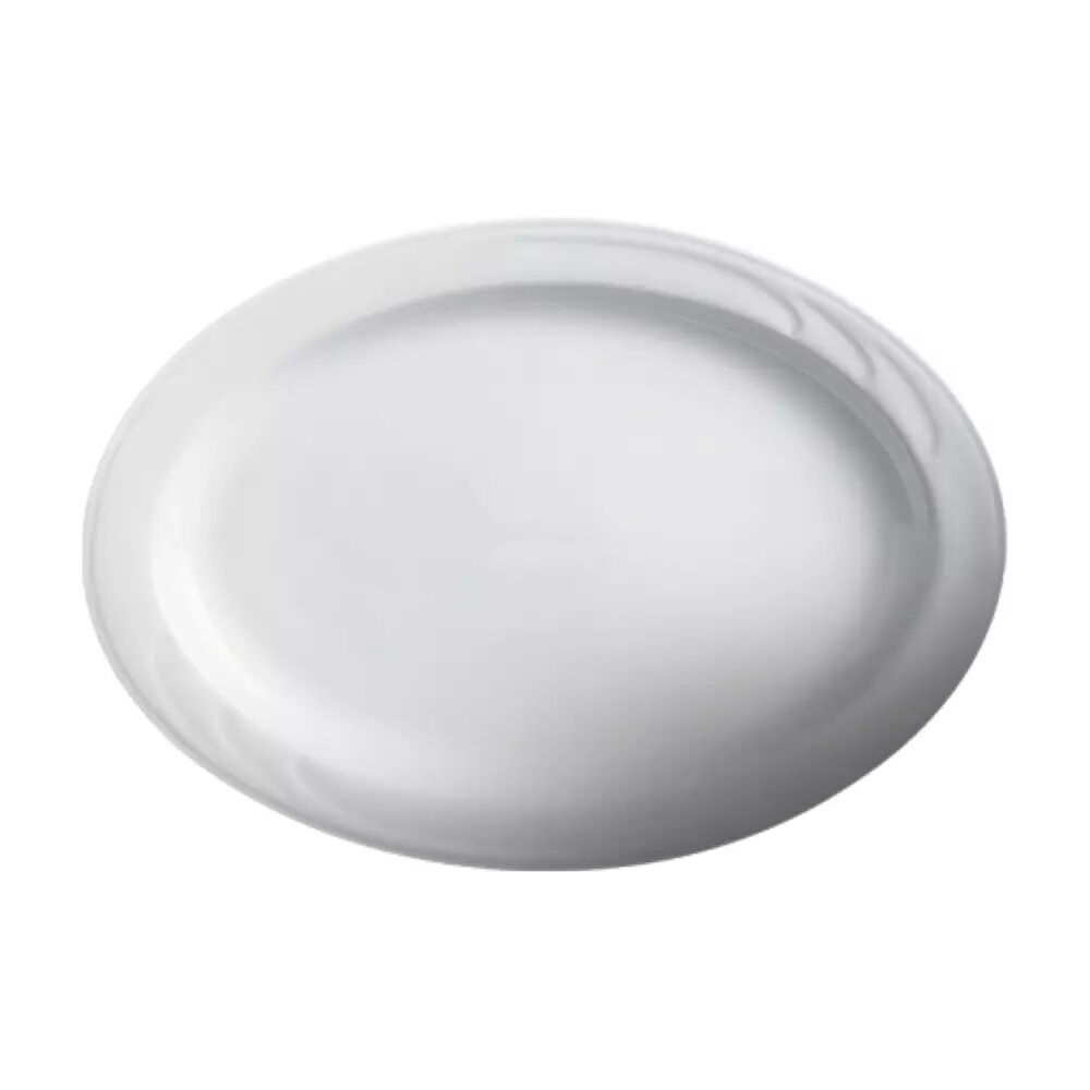 The Oval Platter is an elegant and versatile choice for any restaurant looking to upgrade its serving ware. The classic oval shape of the platter is a timeless design that is sure to complement any table setting. The platter's white finish is sleek and modern, adding a touch of sophistication to your restaurant's presentation.