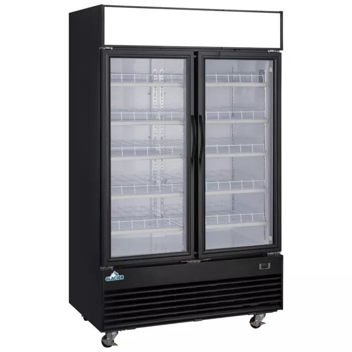 The Glacier 47.5" Merchandiser Refrigerator with 2 Glass Swing Doors, Black Exterior is the ideal solution for presenting your merchandise with style and efficiency. Designed for high-traffic environments, it combines sleek aesthetics with powerful performance. The bright LED lighting and backlit marquee ensure that your products are displayed in the best light, attracting customer attention effortlessly.