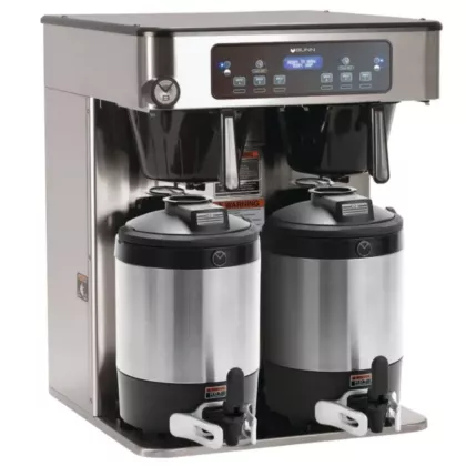 Brews into airpots (2.5 to 3.8 L) or Thermofresh servers (3.8 to 5.7 L), offering flexibility for different service needs. -