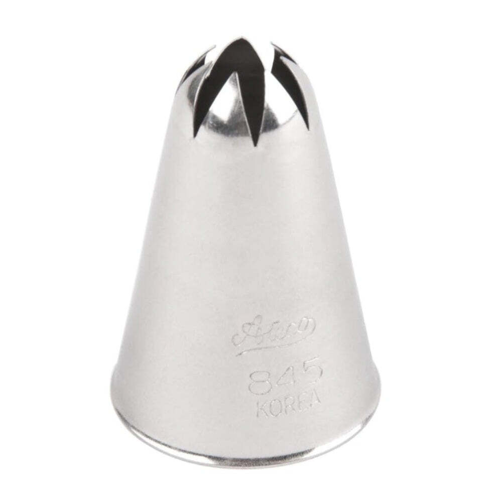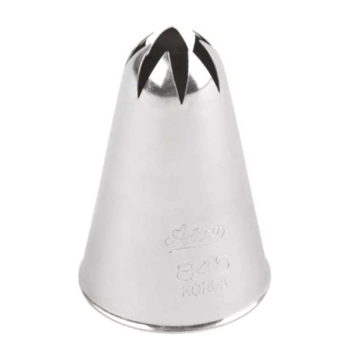 The Ateco is a medium-sized closed star tip designed for creating finely ridged, decorative swirls, stars, and rosettes. Its closely curved teeth produce deep textures with clean edges, making it a staple for elegant dessert presentation.