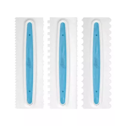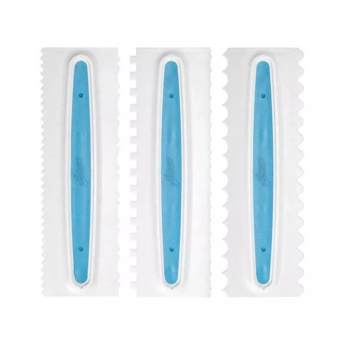 Elevate your cake decorating with the Ateco Icing Comb Set. This set features six unique wide design edges, allowing you to create stunning textured finishes on buttercream cakes with just a swipe of the hand.
