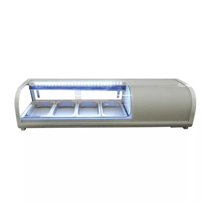 Our sushi case is equipped with a high hermetic compressor for efficient condensing with low energy consumption. Designed with an arc-shaped glass to make the food more visible and give the unit a modern and elegant look.