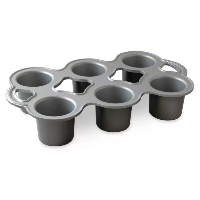 Nordic Ware Grand Popover Pan makes six tasty popovers at a time. The cast aluminum bakeware provides fine details and superior baking performance. The heat reflective exteriors allows for uniform browning so as to enhance the unique design. Bake mouth watering 3/4 cup popovers and over-sized muffins. Also perfect for crown muffins, Yorkshire pudding, and molded desserts. Our center heat vents allow hot air to surround the popover for even cooking. Heavy cast aluminum assures it will not warp and provides long-lasting service. Non-stick finish for easy cleaning.