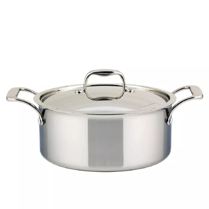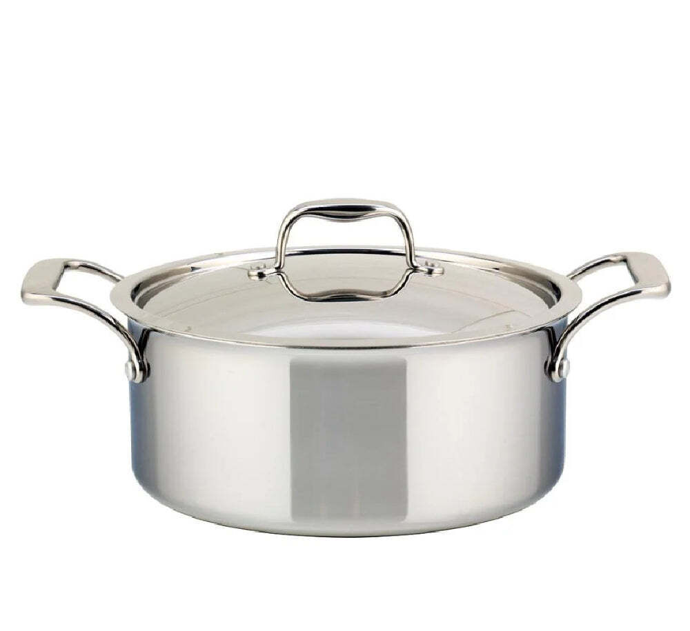The Meyer SuperSteel Dutch Oven is a premium, professional-quality cookware piece made in Canada for home chefs who demand even heat distribution, durability, and versatility. Its five liter capacity and tri-ply design two heavy-gauge stainless steel layers fused to an aluminum core ensure consistent cooking with no hot spots. Oven safe and compatible with all stovetops, including induction, this Dutch oven is ideal for braising meat, cooking soups, stews, sauces, boiling pasta, frying chicken, and more.