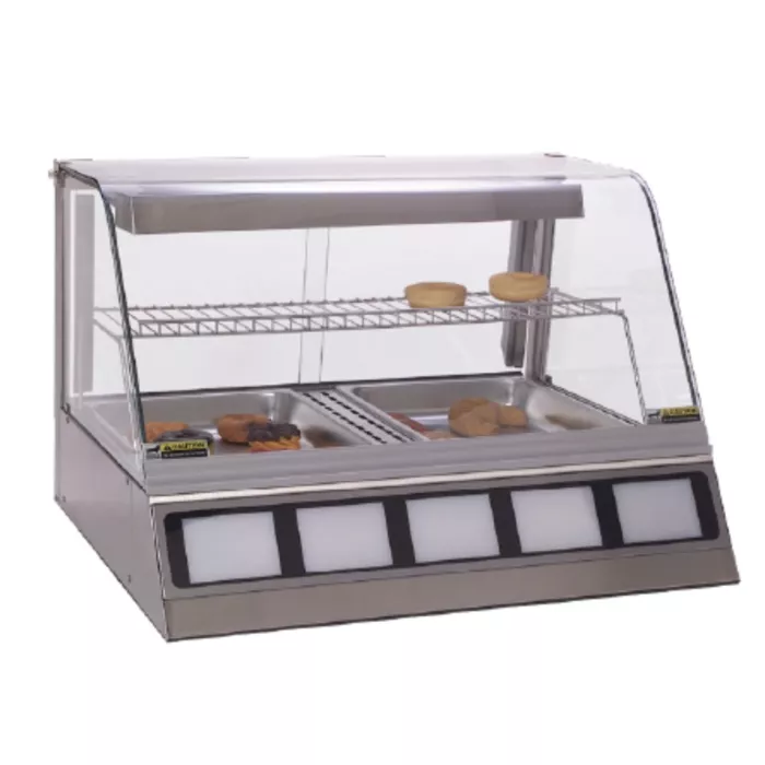 Designed to boost impulse sales and maintain food quality, the Antunes Heated Display Cabinet keeps baked goods and hot foods fresh, warm, and appetizing throughout the day. With a sleek European-style design, this countertop merchandiser features curved tempered glass, bright internal lighting, and glass side panels for full product visibility that draws customer attention. The digital thermostat and electronic controls ensure accurate temperature management, while the rear sliding doors provide easy operator access for quick restocking.