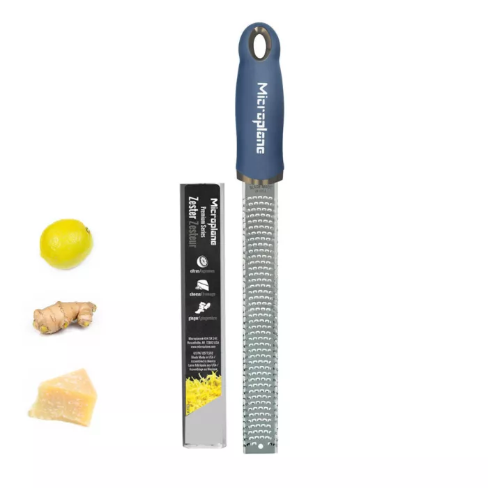 The Microplane 12" Premium Classic Zester / Grater in Sky Blue combines vibrant design with top-tier performance. Featuring an ultra-sharp, photo-etched stainless steel blade made in the USA, this essential kitchen tool effortlessly zests citrus and finely grates hard cheeses, ginger, garlic, nutmeg, chocolate, and more.