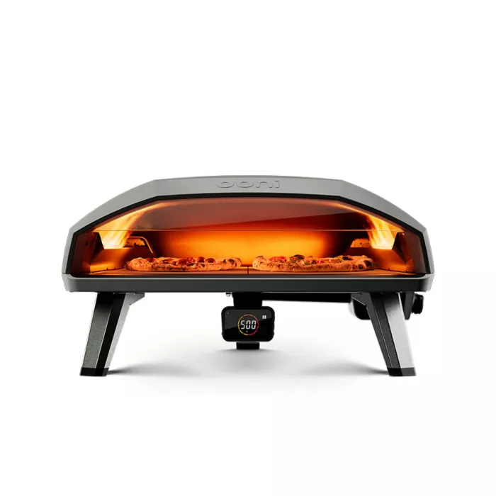 • Ooni Connect™ Digital Temperature Hub: Bluetooth-enabled hub with front display and dual food probes. Syncs with the Ooni app to monitor ambient temp, track cook time, and set alerts.