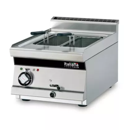 The Italiana Food Tech pasta cooker offers unrivaled cooking results, improved kitchen efficiency, and long-lasting durability — making it the trusted choice for professional kitchens with limited space. It is designed specifically for salt water cooking, ensuring durability and resistance against corrosion.