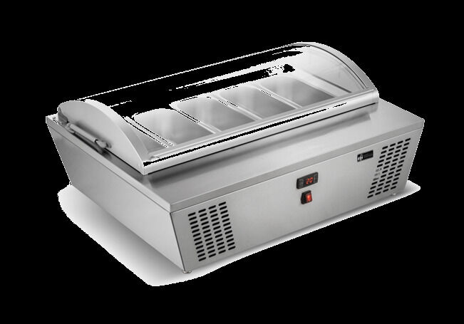 • Construction: Durable stainless steel exterior with folding curved glass lid for product visibility.