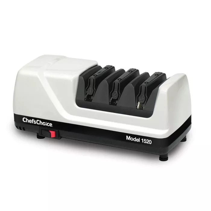 Chef’s Choice Model 1520 Professional Electric Knife Sharpener, a versatile tool for precision sharpening. Featuring a 3-stage AngleSelect® system and Diamond Hone® technology, this knife sharpener restores 15-degree Asian/modern and 20-degree traditional knives, including straight and serrated blades, to razor-sharp perfection.