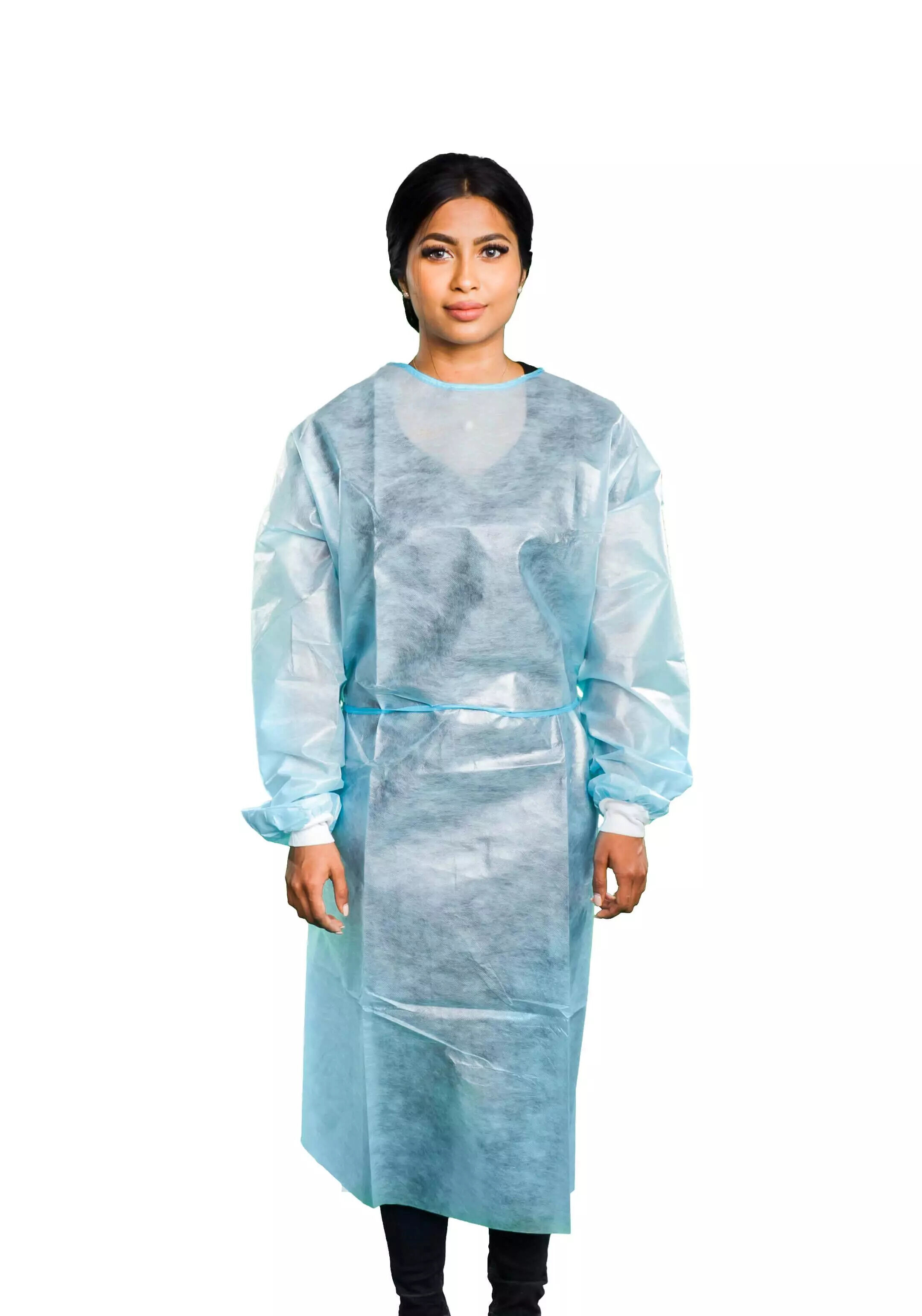 Disposable non-woven isolation gown (inner layer) with polyethylene coating (outer layer)