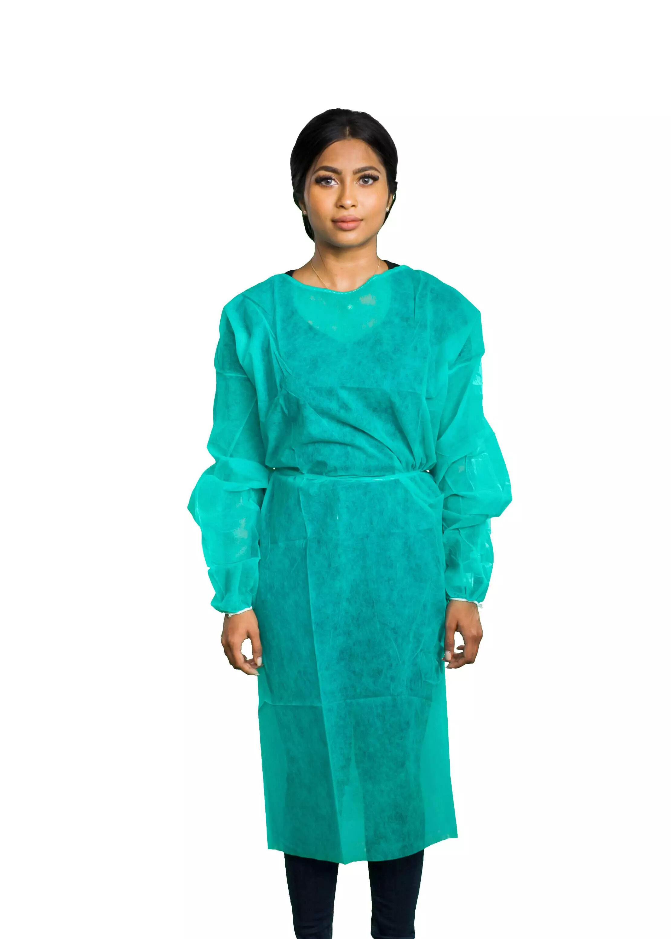 • Disposable non-woven isolation gown (inner layer) with polyethylene coating (outer layer)