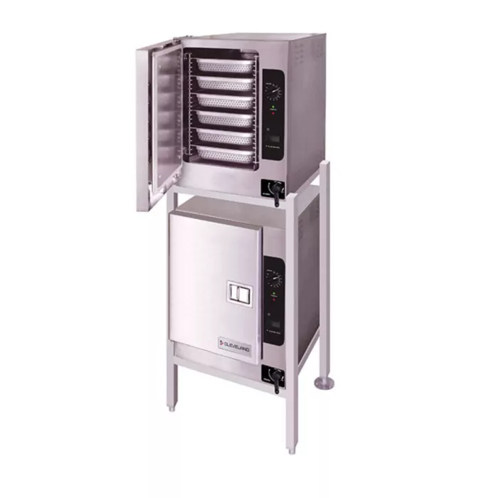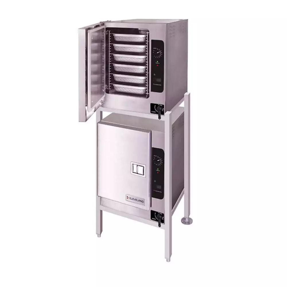 The Cleveland SteamChef 6 Electric 12 Pan Double Deck Convection Steamer 208V 3 Phase features a stacked high-speed electric convection steamer and is designed for use in restaurant, bakery, commercial kitchens. It features heavy duty 14 gauge stainless steel cooking compartment door and latch and can steam up to 6 2.5" full size steam table pans at a time. The Cleveland SteamChef 6 Electric 12 Pan Double Deck Convection Steamer includes energy saving SureCook Compartment Controls with 60-minute automatic timer so you never have to worry about burning or overcooking your foods again! This unit comes standard with a CookTop Drain that allows you to drain safely without having to worry about spills.