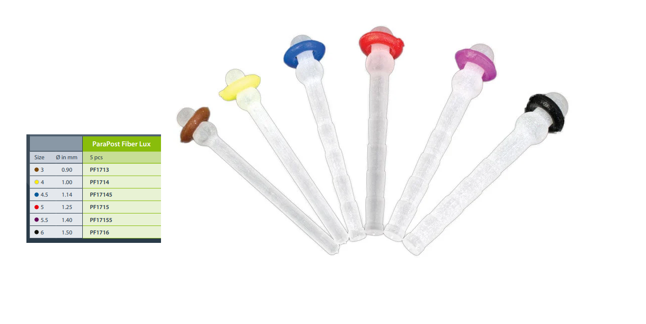 The ParaPost Fiber Lux system is ideal for metal-free high aesthetic restorations. Their cylindrical post design makes them particularly suitable for universal post application. ParaPost Fiber Lux Posts are available in six different sizes and are compatible with standard ParaPost Drills.