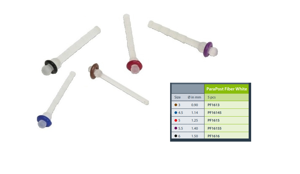 The ParaPost Fiber White system is ideal for metal-free and aesthetic restorations. Their cylindrical post and opaque fiber resin design make them particularly suitable for universal post application and masking discoloured roots. White Posts are available in five different sizes and are compatible with standard ParaPost Drills.