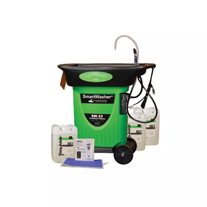 - Includes: 1 SW23 SmartWasher® unit, 3 5-gallon jugs of SW7 cleaning fluid, and 1 regular grade FL4 Ozzymat® filter