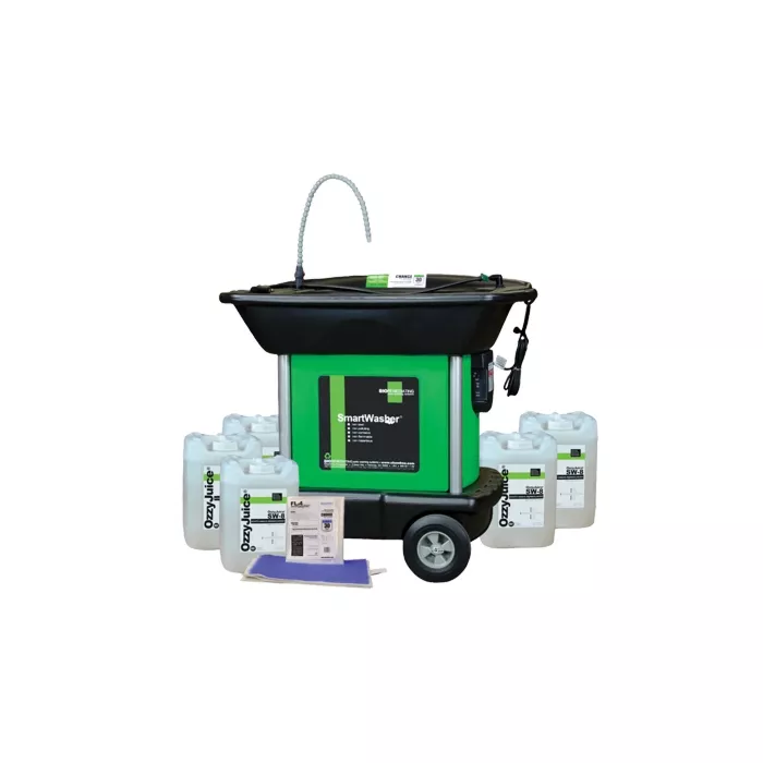 - Includes: 1 SW37 SmartWasher® unit, 5 5-Gallon jugs of SW8 cleaning fluid, and 1 regular grade FL4 Ozzymat™ filter