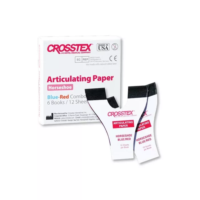 The Crosstex Articulating Paper Horse Shoe Red/Blue is a high-quality dental tool designed to provide precise bite registration and occlusal analysis. Shaped like a horse shoe, this articulating paper is easy to place and remove, ensuring clear and accurate bite marks. Each box contains 72 sheets of durable and reliable articulating paper that features a dual-color system—red on one side and blue on the other—for enhanced visibility and precision.