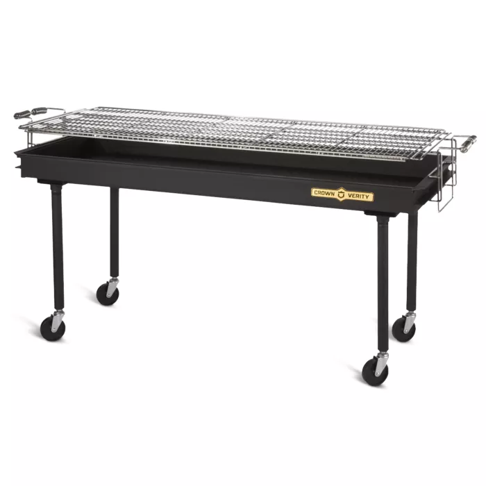 For real charcoal grilling enthusiasts, this heavy duty model, constructed from 14 and 16 gauge cold rolled steel with high heat enamel finish, includes quick release removable legs on castors and offers a massive 5 feet of grilling area. The simple slide action grate provides threes height options on the grilling surface for increased cooking temperature control.