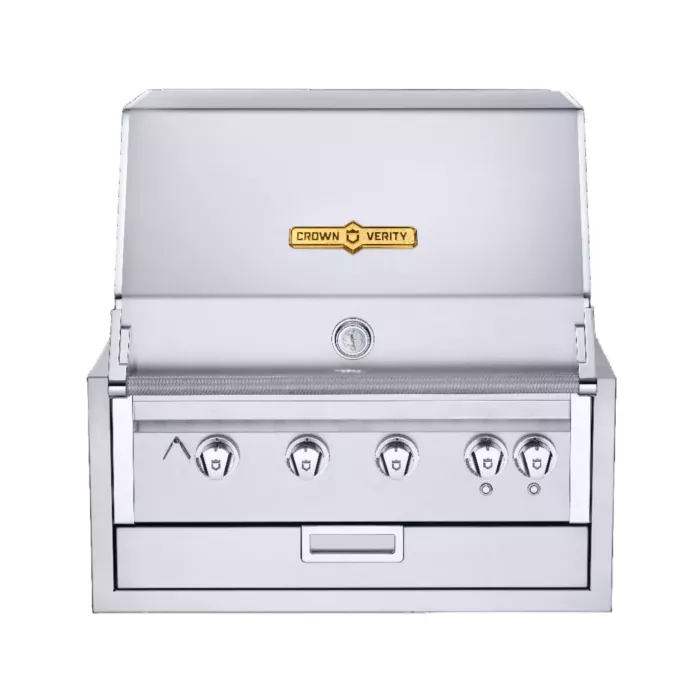 The Crown Verity IBI30NG-LT Infinite Series 30" Built-In Grill with Roll Dome, Bun Rack with Lights brings the precision and performance of commercial kitchens to the outdoor environment. This Infinite Series outdoor grill is perfect for increasing the cooking capabilities of any Crown Verity outdoor kitchen.