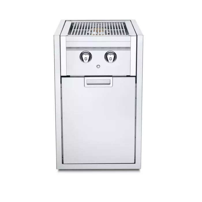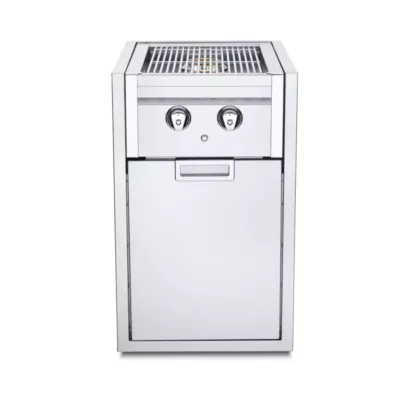 The Infinite Series side burner is perfect for increasing the cooking capabilities of any Crown Verity outdoor kitchen. This unit has two (2) 12,000 BTUH burners with a cabinet and garbage holder. This also includes stainless steel cover.