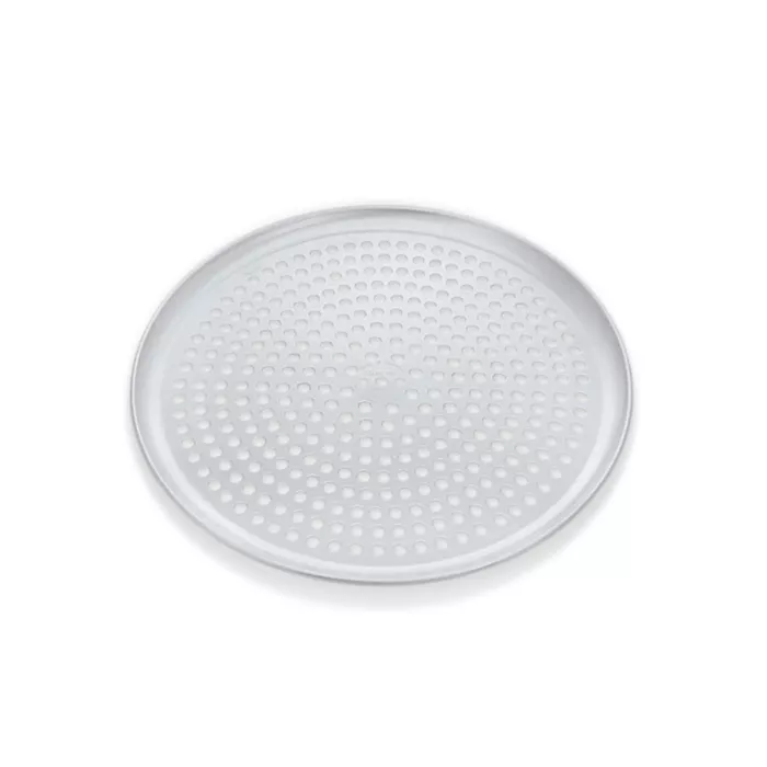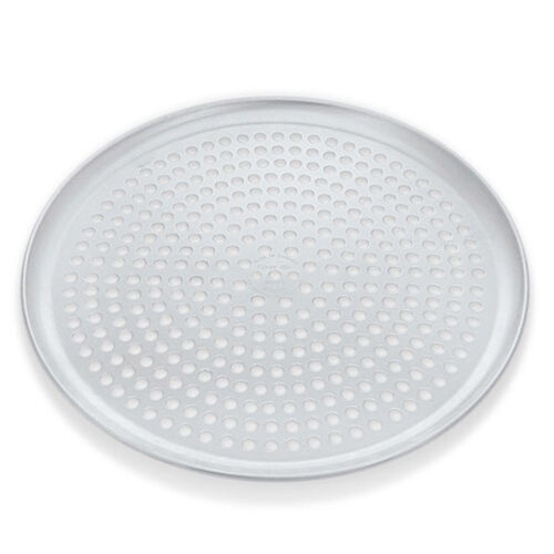 The strength of a pizza pan, with the airflow of a screen. Holes allow heat to penetrate the pizza crust directly, while at the same time steam can easily escape. Combined effect produces a nice toasted brown crust.