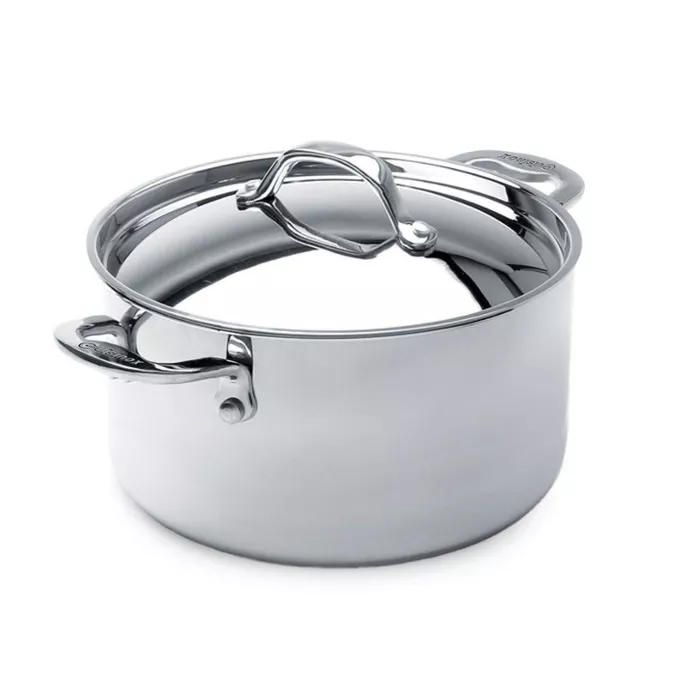 The high luster mirror finish combined with the arched top lid gives this dutch oven is unique look and style. Stainless steel rivets permanently attach our cast stainless steel handles. A pure 18/10 stainless steel assures long-lasting brilliance and easy maintenance. Our 3-ply Surround-Heat® technology distributes heat evenly and efficiently. For use on all cooking surfaces and espcially designed for the new induction cooktops.