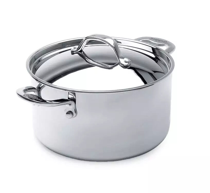 The high luster mirror finish combined with the arched top lid gives this dutch oven is unique look and style. Stainless steel rivets permanently attach our cast stainless steel handles. A pure 18/10 stainless steel assures long-lasting brilliance and easy maintenance. Our 3-ply Surround-Heat® technology distributes heat evenly and efficiently. For use on all cooking surfaces and espcially designed for the new induction cooktops.
