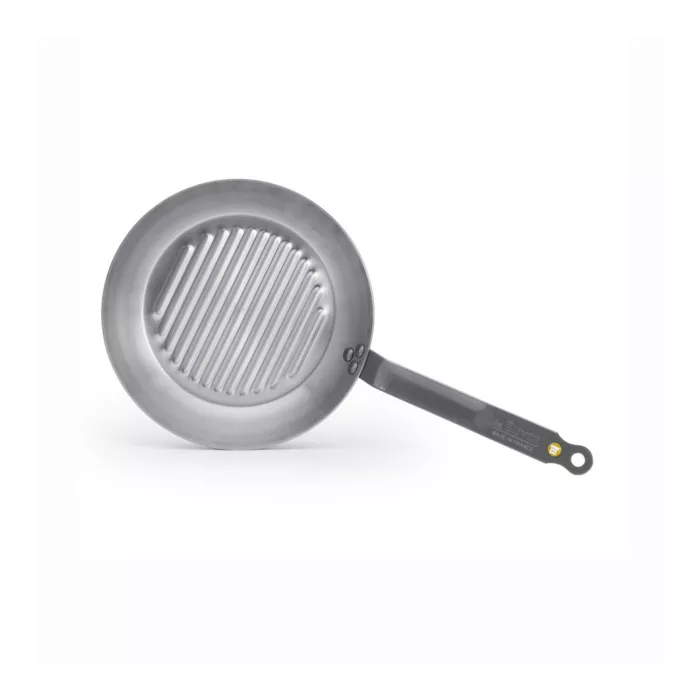 Grill fry pan with a Lyonnaise profile to enable the food to easily slide onto a dish; ideal for searing, grilling, browning. Mineral B Element utensil in heavy quality iron coated with beeswax: organic protective finish against oxidation, facilitates seasoning. Enhanced non-stick qualities when used for the first time. Undeformable thick skirt. Excellent caramelization of food. Natural non-stick properties: gradual seasoning. Riveted handle curved in French-style: easy handling; ergonomic. 10.25"