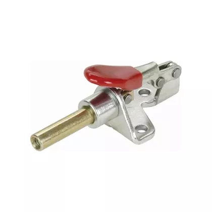 - Popular in assembly operations or used in conjunction with welding jigs. Straight line clamps provide quick, strong holding force. Most clamps lock in two positions allowing them to be used as a push or pull clamp. These models can be bolted or welded to a flat surface. Plungers extend out to clamp material against a fence or square surface. Model TN103 includes a 8-32 nylon spindle assembly (TN126). Model TN105 plunger is tapped for 5/16-18 adjustment spindle (not provided). Model TN107 plunger is tapped for 5/16-18 neoprene tip or other custom fixture.