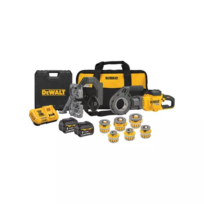 - Includes: (1) Flexvolt® pipe threader, (6) Die heads with high speed steel dies (1/2", 3/4", 1", 1-1/4", 1-1/2", 2"), (1) Pipe clamp, (2) Flexvolt® 20V/60V Max* 9.0 Ah glass-filled nylon batteries, (1) 20V/60V Max* fast charger, (1) Hard carry case, (1) Soft bag
