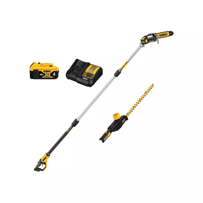 - Includes: Pole saw, Pole hedge trimmer head, Lithium-ion battery, Charger, Shoulder strap, Blade sheath, Tensioning wrench, Bar sheath, Extension pole
