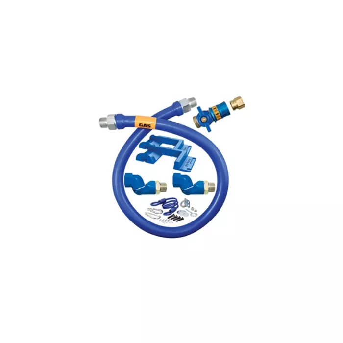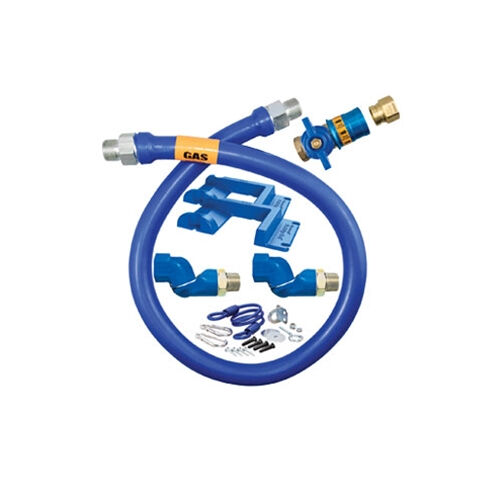 This 1 IN ID, 48 IN long moveable grade gas connector kit contains one connector composed of a 304 stainless steel corrugated tube covered with a tight weave stainless steel braid. The outside connector coating is an antimicrobial PVC coating that inhibits growth of bacteria, mold and mildew on the connector. This kit features a quick disconnect valve combination fitting designed for the foodservice industry and to meet the safety and operational needs of commercial kitchens. It consists of a full port brass ball valve, push to connect quick disconnect with thermal shutoff and an innovative carbon steel safety sleeve that is designed so the gas connector cannot be disconnected until the gas valve is shut off, and cannot be opened until the gas connector is attached. This kit also includes double swivels, two elbows, a restraining cable, and mounting hardware.