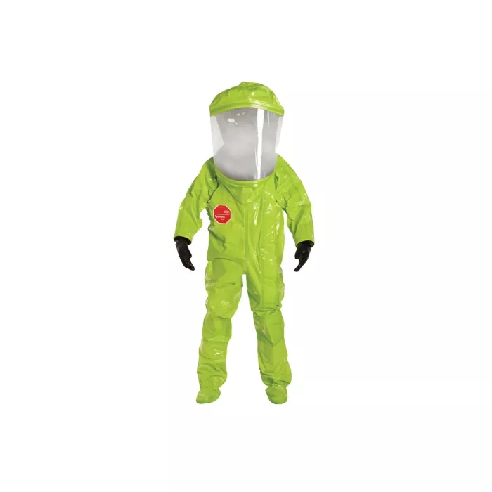 - Attached butyl outer gloves and extra-wide 3-layer faceshield