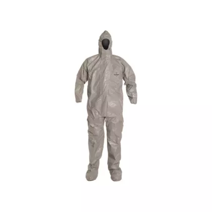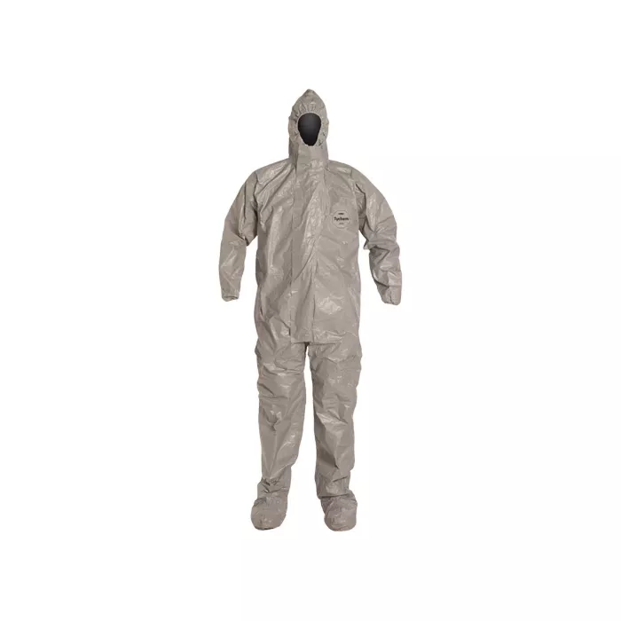 - Taped seams, attached hood (respirator fit), front zipper closure, storm flap, elastic wrists and attached socks
