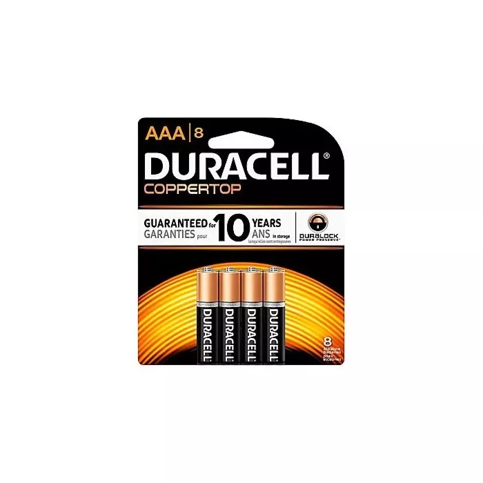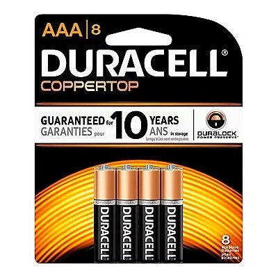 Give new life to your electronic devices with the dependable, long-lasting power of Duracell Batteries. Last up to ten times as long as regular zinc-carbon cellsLong service life at continuous, high drain discharge. Cost-effective on a cost-per-hour-of-service basis. Good low temperature performance. No need for "rest periods". Low internal resistance. Rugged, shock-resistant construction. Excellent leakage resistance and long shelf life. AAA size 8 pack.