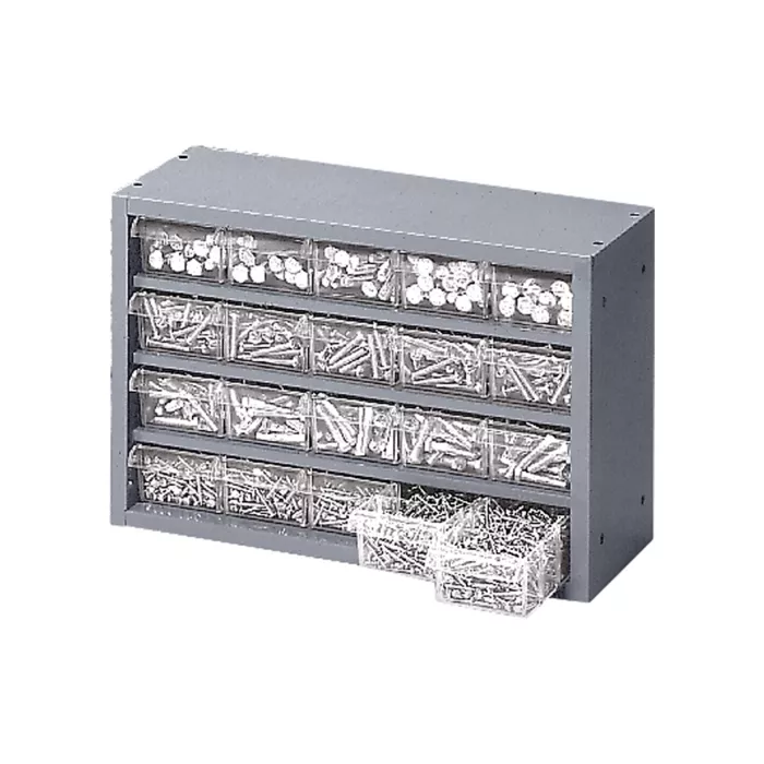 - Heavy duty parts cabinets feature break resistant high impact clear plastic "scoop" drawers for easy removal of small parts, with two adjustable compartment dividers