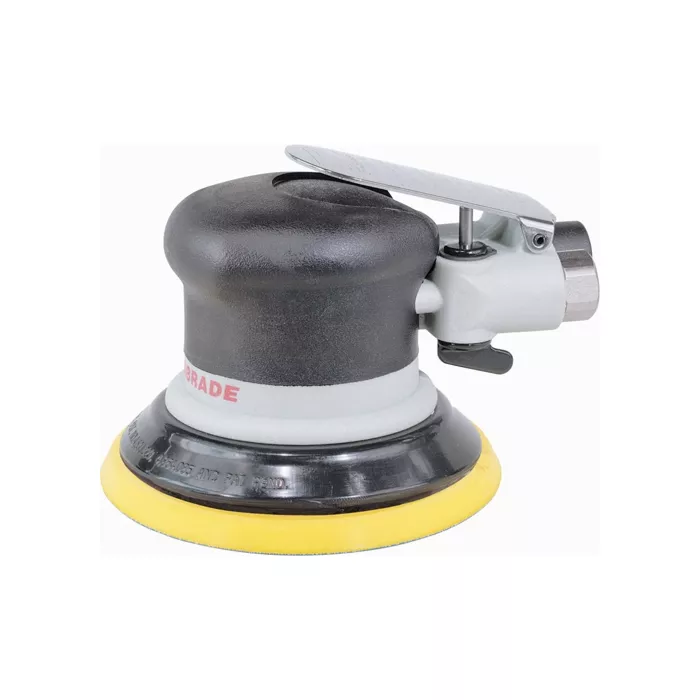 - Random circular & elliptical motion produces superior finishes; ; Model No: TGY822; Mfg. No. 56850; Abrasive Information: 5" dia. discs (127 mm); Pad Information: 5" (127 mm) dia. ; Air Flow Rate @ 90 PSIG: 18 SCFM * 3 CFM @ 90 PSIG ; Sound Level: 78 dB(A); Horsepower: 0.24 HP ; Free Speed: 12,000 RPM ; Air Pressure: 90 PSI ; Air Inlet Thread: 1/4 NPT ; Hose Size (I.D.): 1/4" (6 mm) ; Orbit Diameter: 3/32" (2.4 mm) ; Tool Spindle Thread: 5/16"- 24 female ; Length: 6 1/2" (165 mm); Height: 3 5/8" (92 mm); Weight: 2.1 lbs. (0.95 kg)