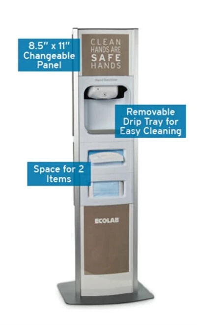- Easy to assemble - Standard 8.5" x 11" changeable panel for customization - Nexa Classic (1250ml) touch free dispenser included - Removable drip tray for easy cleaning - Space for 2 items: masks, facial tissue| Brands | Ecolab |