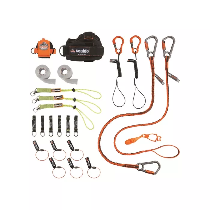 - Includes: (1) 3-pack of Squids® 3713 Elastic Swiveling Tool Tail™ attachments - 10lb , (1) 6-pack of Squids® 3700 Web Tool Tails™ attachments - 2lb, (2) 12 ft. (3.7m) rolls of Squids® 3755 Self-Adhering Tape traps, (1) 6-pack of Squids® 3705 Wire Tool Attachment with Screw Gate Tail™ closures, (1) Squids® 3770L tape measure holder trap, (1) Squids® 3780L Power Tool Holder Battery Wrap, (2) Squids® 3156 coil tool lanyards, single carabiner with 2lb rating, (1) Squids® 3108F(x) tool lanyard, single carabiner with 15lbs rating, (1) Squids® 3118F(x) tool lanyard, dual carabiner with 15lb rating, (1) Squids® 3400 Glove Grabber Dual Clip, (1) Convenient carrying case for easy transportation